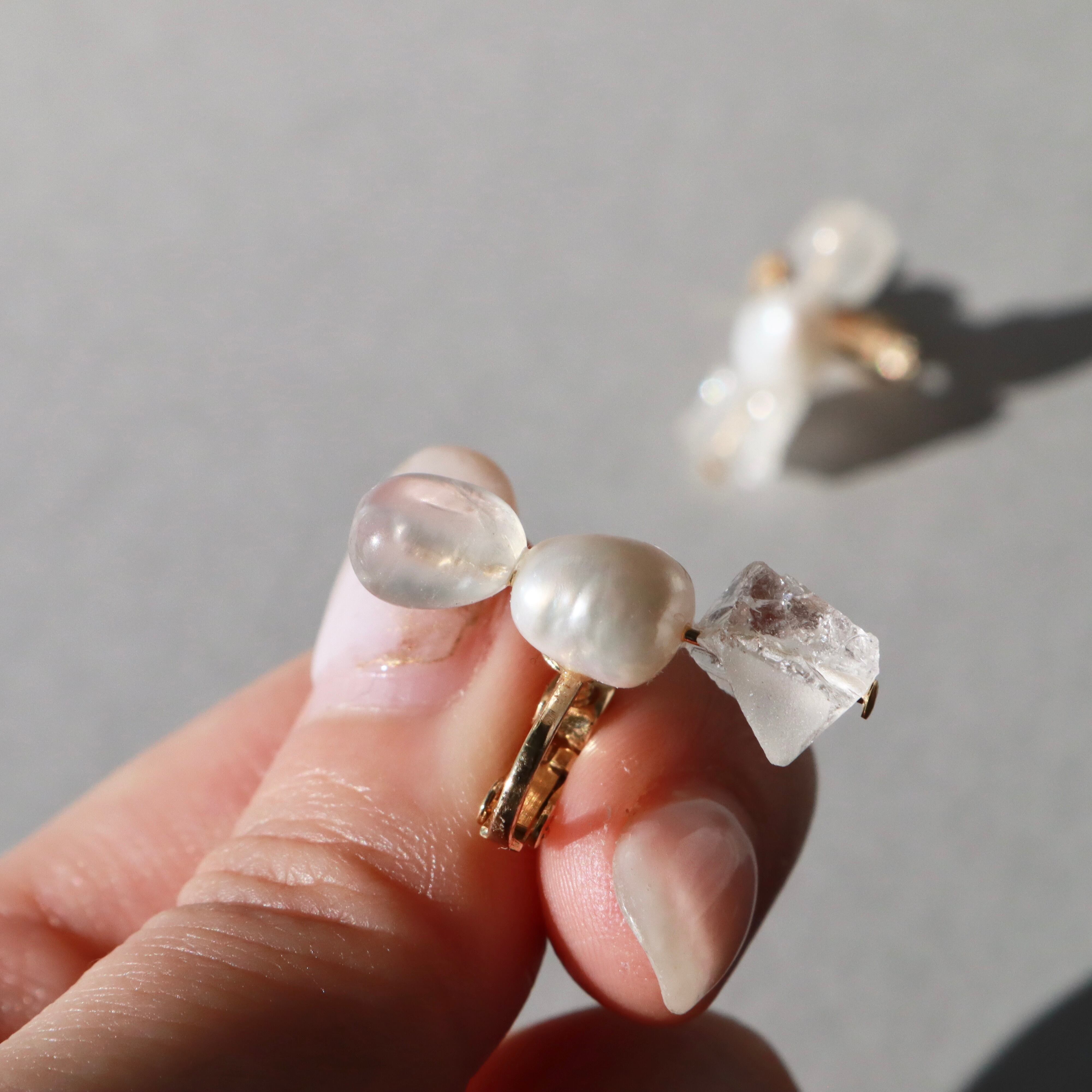 クリスタル、ムーンストーン、淡水パール——それぞれ異なる透明感を一つに束ねました。