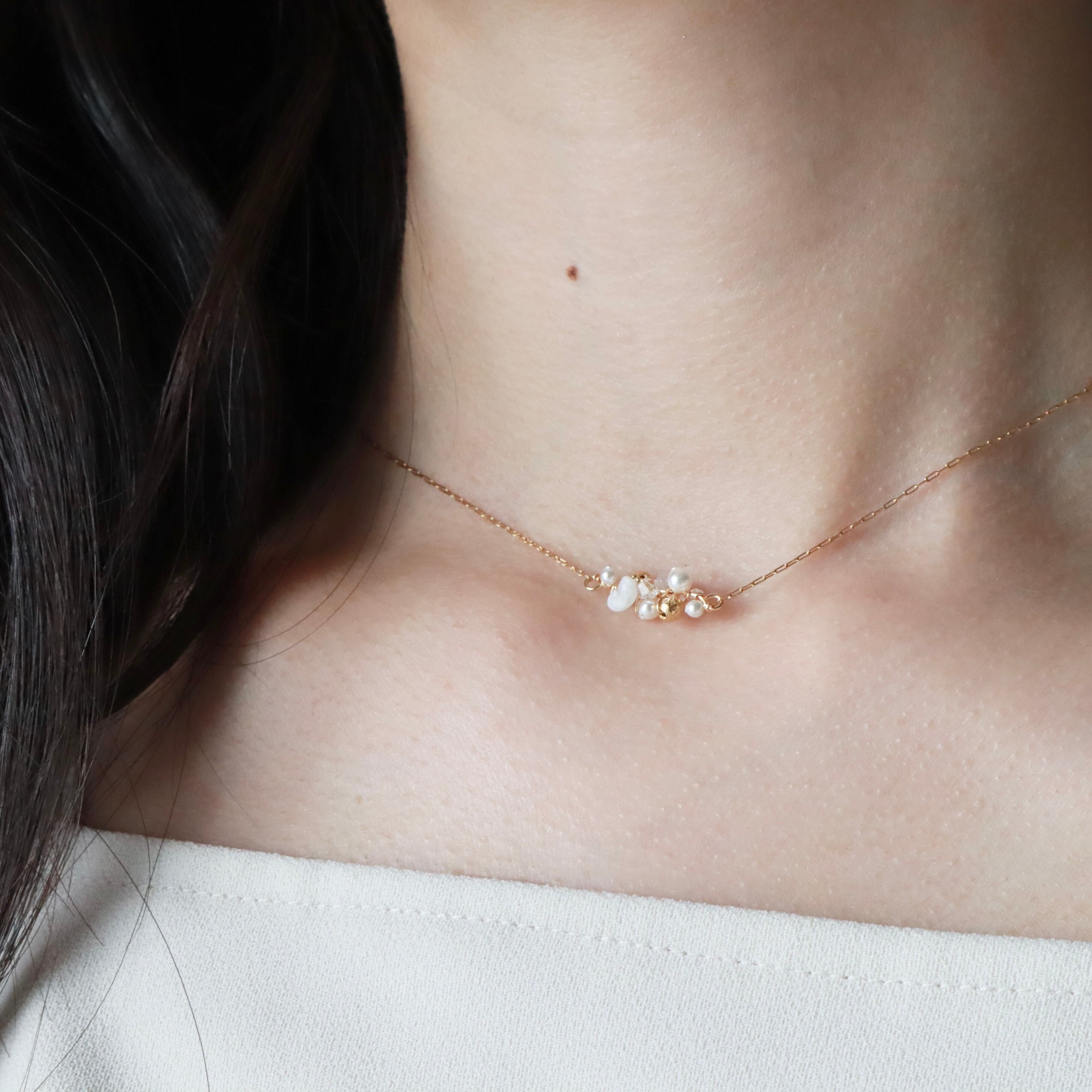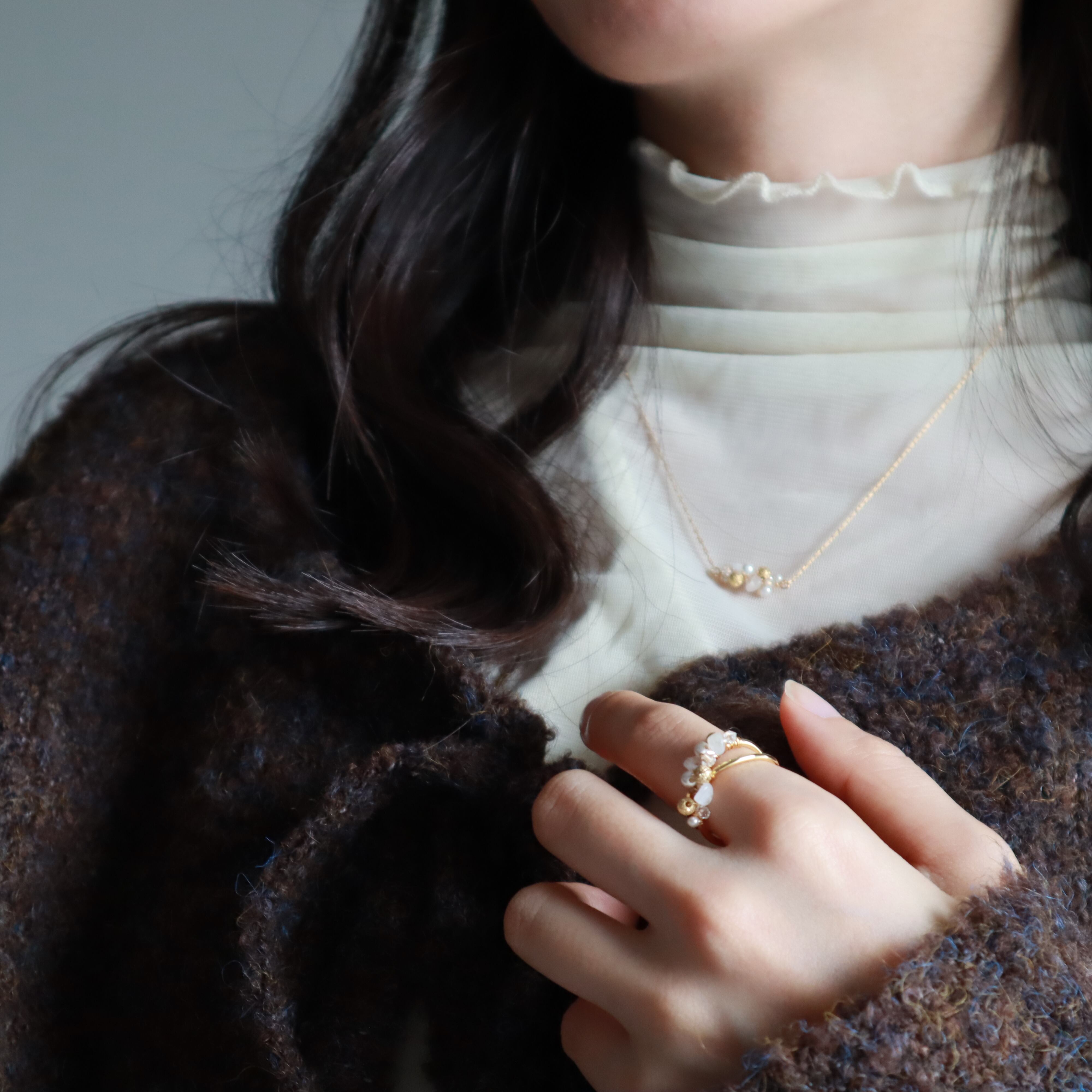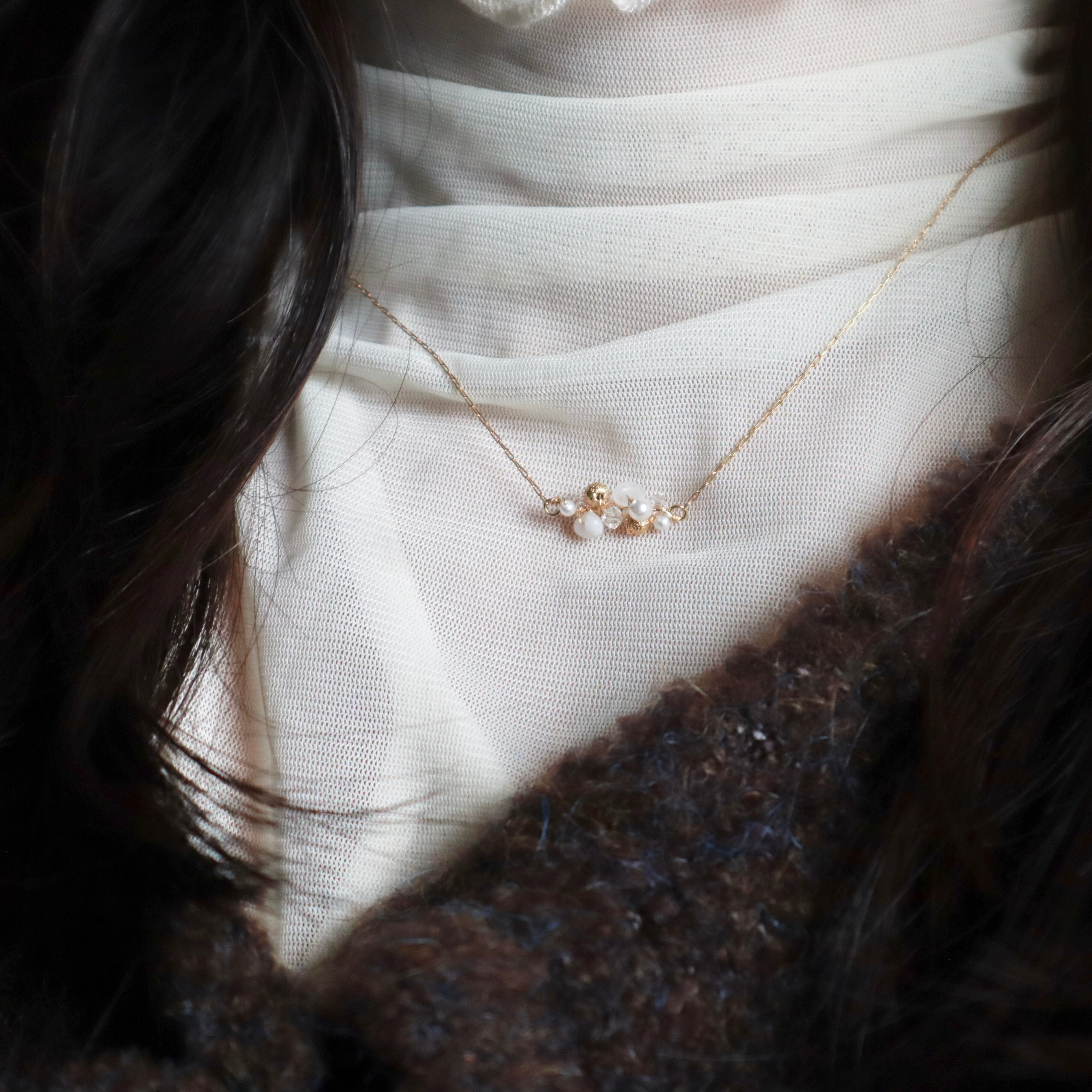 ネックレスは留める金具部分とパーツの部分を対称の位置につけているので、いつの間にか金具が胸元にきてるという心配はいりません。